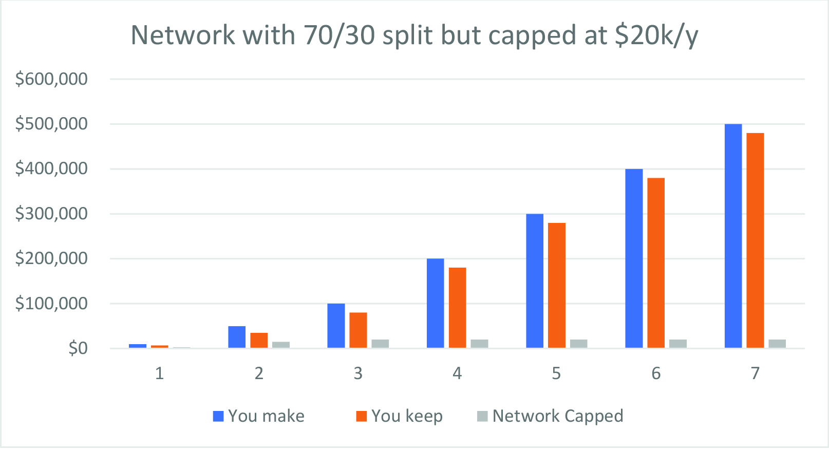 As you can see, the cap pays off in the long run as your agency grows. So, in a network without a cap on commission splits, no matter how large and how successful you become, as you grow, you’re always paying more of your hard-earned income.