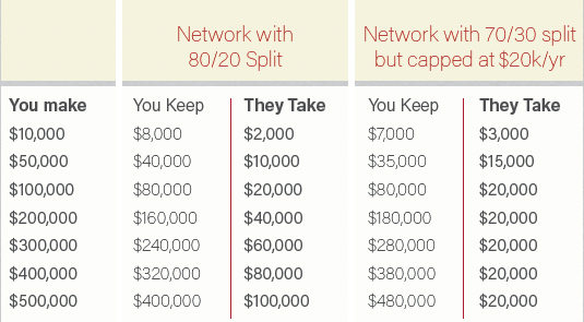 Networks and alliances make money in three ways – fees, bonuses, and commission splits. To determine which network has the best financial offering for you, you’ll need to weigh each alliance’s fee and compensation structure on those three things.